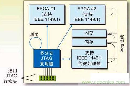 在每塊電路板上添加一個(gè)策略性IC器件-JTAG復(fù)用器件,目的是去除電路板上的多個(gè)1149.1接頭并管理多個(gè)JTAG通路。這個(gè)JTAG復(fù)用器件所占用的電路板空間通常比一個(gè)JTAG接頭還小,但卻簡(jiǎn)化了元件的隔離,也簡(jiǎn)化了提高接入效率所需掃描路徑的組織。