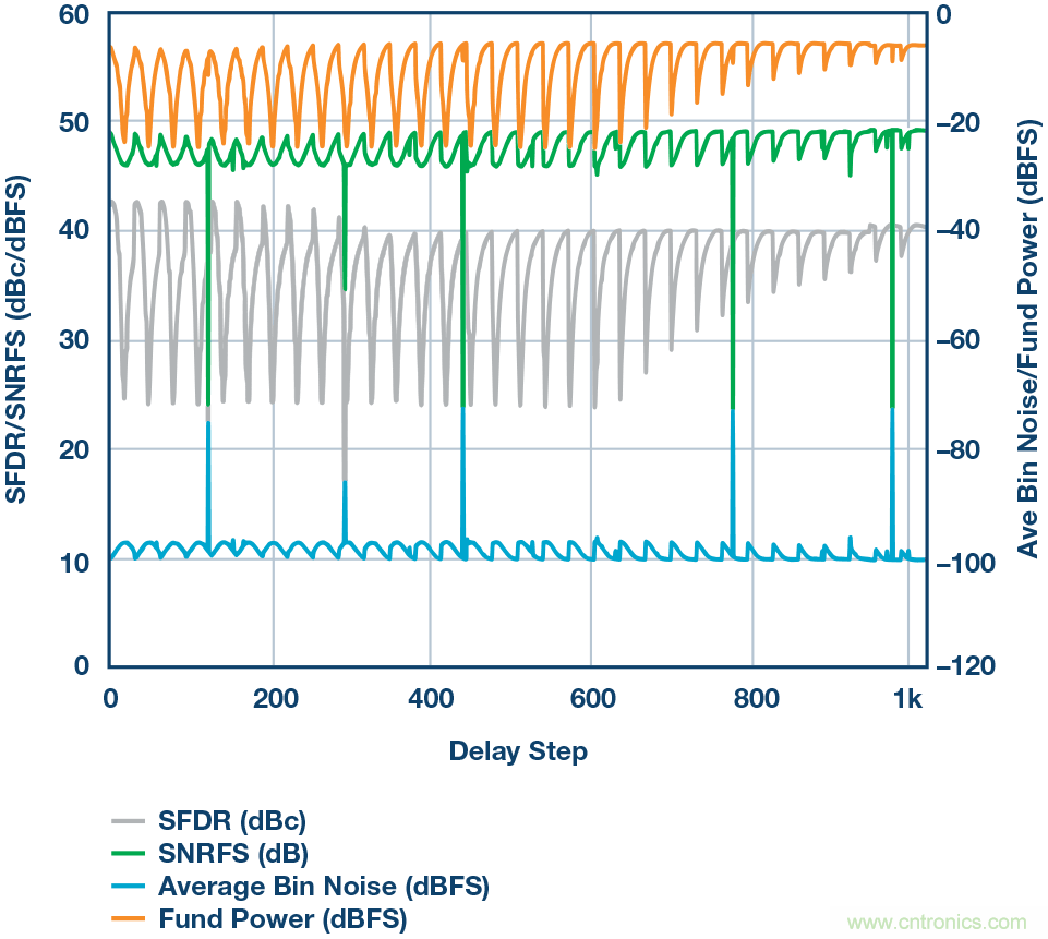 為了獲得最佳延遲設(shè)置,將一個(gè)信號(hào)施加于THA和ADC組合,該信號(hào)應(yīng)在ADC帶寬范圍之外。本例中,我們選擇一個(gè)約10 GHz的信號(hào),并施加-6 dBFS的電平(在FFT顯示屏上捕獲)。延遲設(shè)置現(xiàn)在以二 進(jìn)制步進(jìn)方式掃描,信號(hào)的電平和頻率保持恒定。在掃描過程中顯示并捕獲FFT,收集每個(gè)延遲設(shè)置對應(yīng)的基波功率和無雜散動(dòng)態(tài)范圍 (SFDR) 數(shù)值。