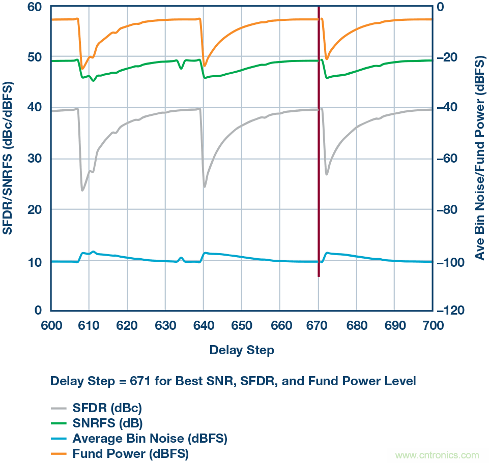 結(jié)果如圖3a所示,基波功率、SFDR和SNR將隨所應(yīng)用的每個(gè)設(shè)置而變化。如圖所示,當(dāng)把采樣位置放在更好的地方(THA將樣本送至ADC的過程之中)時(shí),基波功率將處于最高水平,而SFDR應(yīng)處于最佳性能(即最低)。圖3b為延遲映射掃描的放大視圖,延遲設(shè)定點(diǎn)為671,即延遲應(yīng)該保持固定于此窗口/位置。請記住,延遲映射程序僅對系統(tǒng)的相關(guān)采樣頻率有效,如果設(shè)計(jì)需要不同的采樣時(shí)鐘,則需要重新掃描。本例中,采樣頻率為4 GHz,這是該信號(hào)鏈中使用的THA器件的最高采樣頻率。