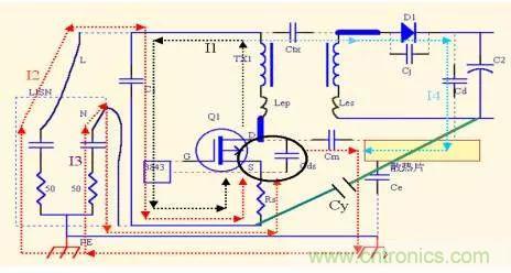 它的作用是雙重的,一是為Mosfet動(dòng)作產(chǎn)生且串到變壓器副邊的noise 電流(如I4),提供一個(gè)低阻抗的回路,減小到地的電流。二是為二次側(cè)Diode產(chǎn)生的且串到變壓器原邊的noise 電流提供低阻抗回路,從而減小流過LISN的電流。