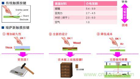 相對(duì)于傳統(tǒng)觸摸按鍵,新的觸摸功能按鍵可以透過10mm厚度的亞克力材料或者木板進(jìn)行感應(yīng),具有更加堅(jiān)固的耐久性,無需使用觸摸感應(yīng)彈簧。它與輕觸按鍵相比,耐久性增強(qiáng),并且具有抗污防水能力,可以大大降低按鍵的錯(cuò)誤率。