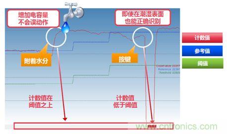 由于潮濕的表面,會(huì)增加電容量。即使在潮濕的表面,也能正確識(shí)別按鍵,從而避免了電容自感方式下的觸摸誤動(dòng)作。