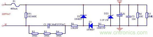 采用半波整流方式,根據(jù)計(jì)算式I1=0.5|I|=34500C可知,C=0.43uF。所以此處選用0.47uF的電容,反過來可以驗(yàn)證提供的電流I1=34500C=16.2mA,多余電流從穩(wěn)壓管流過。