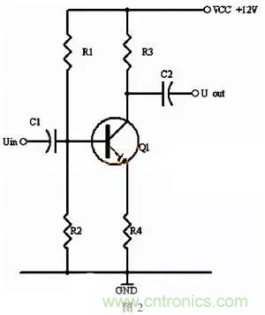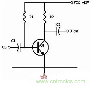 同理,當輸入信號減小時,則Ib減小,Ic電流減小,則電阻R2的電壓U2=Ic×R2會隨之減小,Uce=VCC-U2,會變大。在輸入信減小時,Uce最大變化是從1/2的VCC變化到VCC。這樣,在輸入信號一定范圍內(nèi)發(fā)生正負變化時,Uce以1/2VCC為準的話就有一個對稱的正負變化范圍,所以一般圖1靜態(tài)工作點的設(shè)置為Uce接近于電源電壓的一半。