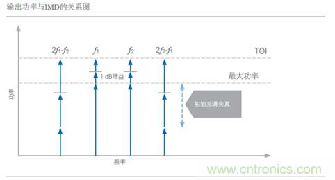 在許多器件的線性工作區(qū)域中,一階音和三階失真產物的比率常常很高。然而,隨著基音輸入功率的增加,三階失真產物也隨之增加。實際上,基音的功率每增加1 dB,互調失真產物會增加3 dB。