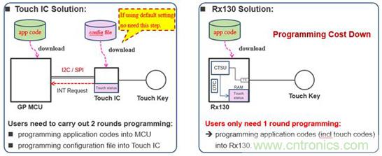 從程序燒寫的成本,比較二者的不同。如圖4所示,如果用戶不使用觸控 IC的缺省參數(shù),而是使用結(jié)合具體應(yīng)用方案優(yōu)化后的參數(shù),那么需要通過編程器將最新的參數(shù)固化到觸控 IC。特別是批量生產(chǎn)時,增加了燒錄觸控 IC的額外成本。而右圖所示的Rx130方案中,僅需要將應(yīng)用程序燒錄到Rx130中。