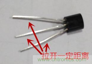 1.首先將三極管的三個(gè)管腳前后或者左右拉開(kāi)一定距離,以便于測(cè)量;這樣可以避免表筆短路,如下圖三所示: