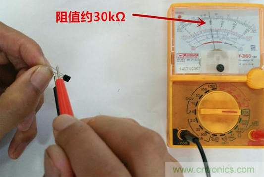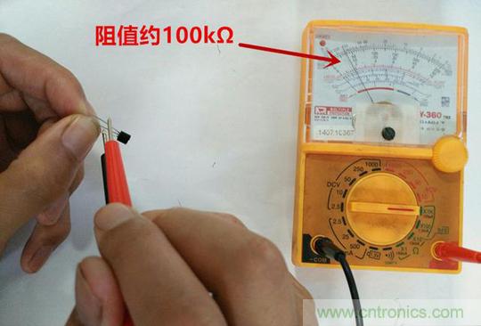 2.然后用拇指和食指捏住基極和另一個(gè)腳(假定該腳為集電極),方法同上,記錄顯示值R2;
