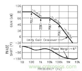 假設(shè)直流增益為80dB(10-100Hz處的增益),100到1KHz增益減少了20dB,10K-100KHz增益減少20dB,100K-1MHz增益減少40dB(斜率有-20dB/10倍頻的變化)。圖中可以看出有3個(gè)POLE,一個(gè)ZERO。1MHz處的增益是0dB,說明1MHz的小信號在此截止,此回路的帶寬就是1MHz。