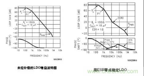 一般的LDO會(huì)由負(fù)載阻抗、輸出容抗等自身產(chǎn)生一些極點(diǎn)。圖中有3個(gè)極點(diǎn)(具體由來就不做分析,可由網(wǎng)絡(luò)分析儀掃描出),但有1個(gè)Ppwr在0dB之后的頻段,也就是帶寬之外,可以不考慮。從上面兩幅波特圖的對比看出,第二張圖增益曲線,當(dāng)增加了輸出電容后,從80dB到0dB變得更平緩些。系統(tǒng)的帶寬大概從40KHz增加到100KHz左右。相位裕度也相應(yīng)的增加(此例就不仔細(xì)計(jì)算了)。