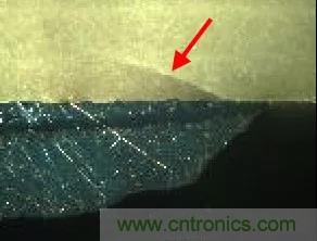 因為MLCC主要成分是陶瓷,在放置元件,分板,上螺絲等工序中,很可能因為機械應(yīng)力過大導(dǎo)致電容受擠壓破裂,從而導(dǎo)致潛在的漏電失效。此時的裂縫一般呈斜線,從端子與陶瓷體的結(jié)合處開裂。