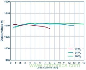 有關(guān) LT8304-1 周圍組件所承受之電壓和電流應(yīng)力計(jì)算的說明,詳見 LT8304-1 的數(shù)據(jù)手冊。值得注意的是,這款 1000 V 解決方案采用了一個(gè)在副邊具有 3 個(gè)分離輸出繞組的變壓器。原邊至副邊匝數(shù)比為 1:10:10:10,而不是單副邊繞組 1:30 匝數(shù)比變壓器。1:10:10:10 變壓器使得輸出電壓應(yīng)力可在 3 個(gè)高電壓輸出二極管和 3 個(gè)高電壓輸出電容器之間分擔(dān)。單個(gè)組件的電壓額定值只需為總電壓的 1/3,因而有利于獲得更多可供選擇的輸出二極管和輸出電容器。圖 2 顯示這款峰值效率達(dá)到 90.5% 的反激式轉(zhuǎn)換器。即使未采用光耦合器,各種不同輸入電壓下的負(fù)載調(diào)節(jié)仍然很緊,精度通常為 2% 至 3%,如圖 3 所示。