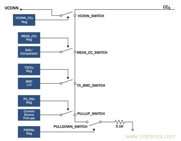 FUSB302B實(shí)施了一個(gè)CC開關(guān),使它能夠檢測(cè)到它是作為設(shè)備主機(jī)還是雙角色端口連接,通過多個(gè)比較器和由主機(jī)處理器上的軟件控制的可編程DAC進(jìn)行管理(圖3)。