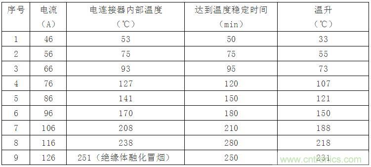 取8芯電連接器1套,接觸體壓接16mm2導(dǎo)線,送入后將所有孔位串聯(lián),通以額定電流,當(dāng)電連接器內(nèi)部溫度穩(wěn)定后,逐步增加電流值,直至溫度超過電連接器承受能力。試驗(yàn)結(jié)果見表2: