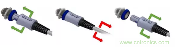 為提高安全性,IEC規(guī)定了鎖定機制,防止在醫(yī)療過程中意外斷開。鎖定機構(gòu)通常與電氣連接空間相沖突,有多種形式,如按鈕鎖定(拇指鎖存)、扭轉(zhuǎn)鎖定(通過旋轉(zhuǎn)鎖?。┮约傲餍械耐评i定系統(tǒng),推拉鎖定系統(tǒng)將閉鎖設(shè)計集成到咬合結(jié)構(gòu)中,消除了其他選項所需的二次動作,緩解它們所面臨的設(shè)計挑戰(zhàn)。