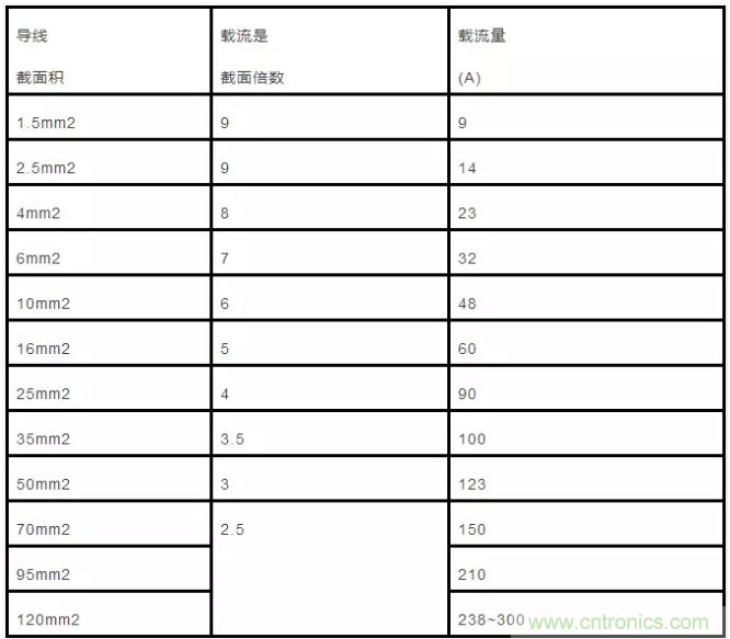 2.5mm’及以下的各種截面鋁芯絕緣線,其載流量約為截面數(shù)的9倍。如2.5mm’導(dǎo)線,載流量為2.5×9=22.5(A)。從4mm’及以上導(dǎo)線的載流量和截面數(shù)的倍數(shù)關(guān)系是順著線號(hào)往上排,倍數(shù)逐次減l,即4×8、6×7、10×6、16×5、25×4。
