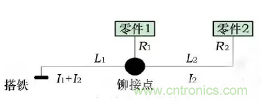 R1—零件1的電阻, L1—鉚接點(diǎn)到搭鐵點(diǎn)的導(dǎo)線電阻, R2—零件2的電阻,L2—零件2到鉚接點(diǎn)的導(dǎo)線電阻