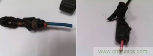而在失效的樣品中就有兩個是用了不同的電纜,且外徑相差懸殊。圖11 中的左側圖連接器一側用的是光伏電纜(黑色),外徑為6mm,而另一側則是用的 普通線纜(藍色),外徑僅為4mm。將藍色電纜端的螺帽擰開后發(fā)現(xiàn)可能由于密封不夠竟采用了紅色塑料片填充。在該種情況下連接器是很難保證其密封性,因此,在戶外應用時有可能會進水進塵,從而破壞絕緣性能,進而引發(fā)火災。