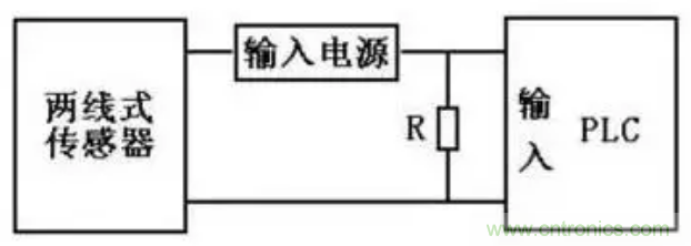 傳感器的種類(lèi)很多,其輸出方式也各不相同。當(dāng)采用接近開(kāi)關(guān)、光電開(kāi)關(guān)等兩線式傳感器時(shí),由于傳感器的漏電流較大,可能出現(xiàn)錯(cuò)誤的輸入信號(hào)而導(dǎo)致PLC的誤動(dòng)作,此時(shí)可在PLC輸入端并聯(lián)旁路電阻R,如圖3所示。當(dāng)漏電流不足lmA時(shí)可以不考慮其影響。