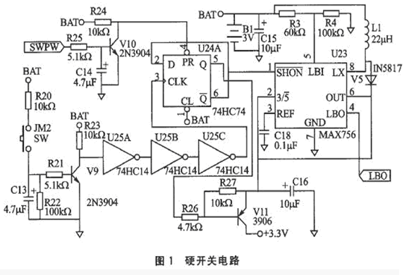 硬開關(guān)電路是將2節(jié)7號電池的串聯(lián)電壓通過DC/DC轉(zhuǎn)換器MAX756轉(zhuǎn)換成3.3 V的電壓,電路圖如圖1所示。如果不經(jīng)升壓電路而直接由電池供電,那么因電池端產(chǎn)生的電壓存在一個由高到低的下降過程。2節(jié)新電池的串聯(lián)電壓在3 V以上,隨著能量的耗盡,會下降到2V以下,導(dǎo)致機器無法正常工作。JM2按鍵為開/關(guān)機鍵,在按動JM2時,由于按鍵的抖動,會產(chǎn)生誤動作。由R20, C13, R21,R22, R23, V9構(gòu)成的充放電回路,作用是通過適當(dāng)?shù)剡x擇R20,C13,R21的值,使充放電回路的充電時間與放電時間都大于鍵抖動時間,從而有效地消除鍵的抖動。V9集電極輸出的按鍵脈沖經(jīng)去抖后,再通過U25 (74HC14)三個帶施密特觸發(fā)器的反相器進(jìn)一步濾波整形,產(chǎn)生波形完整的單脈沖。由該脈沖觸發(fā)U24A(74HC74 D觸發(fā)器)的翻轉(zhuǎn)。