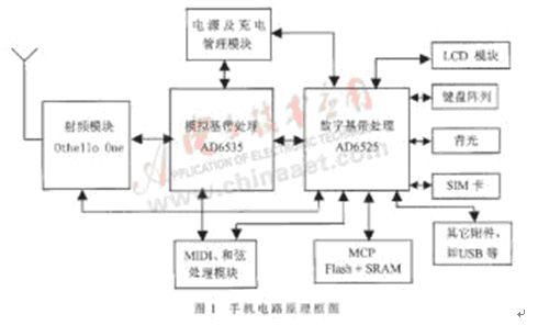 數(shù)字移動電話的電路由射頻與基帶兩大部分組成。其中射頻(RF)電路包括收發(fā)器、頻率合成器和功放等,基帶(Baseband)電路包括數(shù)字信息處理和控制器、存儲器、電源管理和其他外設(shè)部分。以ADI手機(jī)為例,其原理框圖如圖1所示。