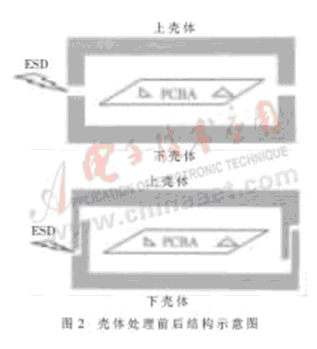 其一,用“堵”的方法。盡量增加殼體的厚度,即增加外殼到電路板之間的距離,或者通過一些等效方法增加殼體氣隙的距離,這樣可以避免或者大大減少ESD的能量強(qiáng)度,如圖2所示。