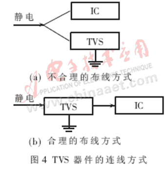 因為TVS具有體積小、反應(yīng)速度快等優(yōu)點,現(xiàn)在的設(shè)計中使用TVS作為防護(hù)器件的比例越來越多。目前TVS級間等效電容越做越小,所以適合芯片的保護(hù)。在使用時應(yīng)注意放在需要保護(hù)的器件旁邊,到地的連線盡可能短,器件的布線應(yīng)成串聯(lián)型,而不能布成并聯(lián)型。如圖4所示。