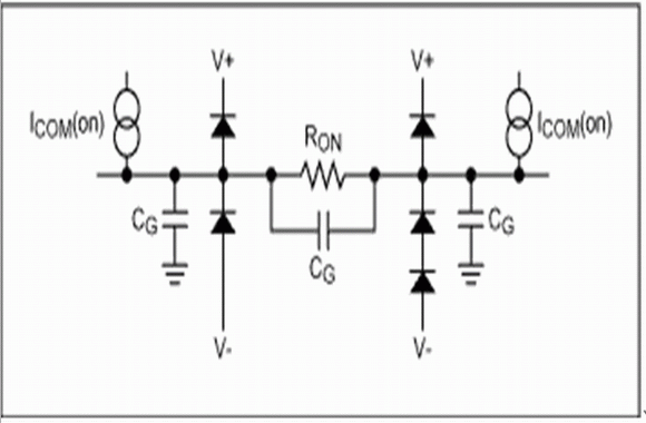 模擬開關(guān)內(nèi)的通道元件通常包括一個(gè)或更多的MOSFET,同時(shí)還包含有寄生鉗位二極管(鉗位至電源電壓),用于ESD保護(hù)。圖1顯示了一個(gè)閉合的模擬開關(guān)的等效電路圖。只要V+和V-存在,并且輸入電壓不超過:電源電壓 + 鉗位二極管的正向偏壓(典型0.6V),二極管就處于反向偏置,沒有電流通過。