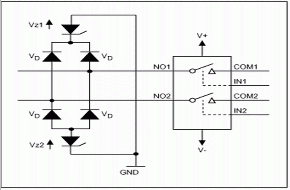 在現(xiàn)有設(shè)計(jì)中,大多數(shù)系統(tǒng)工作于標(biāo)準(zhǔn)電源電壓(單極性3.3V或5V,或雙極性±3.3V或±5V),這個(gè)電壓通常也是板上的最高電壓。在實(shí)際使用中,電路板的輸入端子可能會(huì)暴露于比電源電壓更高的電壓之下,同時(shí),電路板電源被切斷后,輸入端子上的電壓有可能仍然存在。受這種過壓影響的第一個(gè)元件常常是多路復(fù)用器或開關(guān),這就要求為開關(guān)元件和下游電路提供適當(dāng)?shù)谋Wo(hù)。