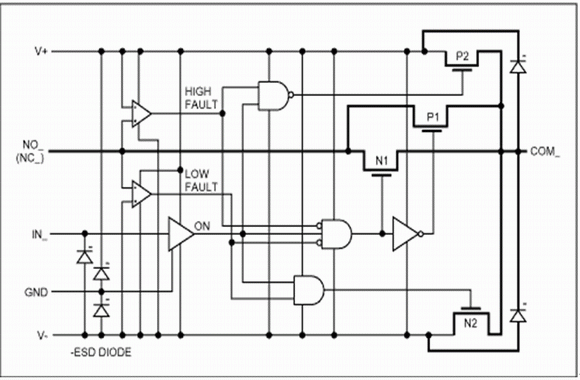 開關(guān)內(nèi)部的兩個(gè)比較器用于監(jiān)視輸入電壓,它們將輸入電壓與電源電壓V+和V-進(jìn)行比較。當(dāng)NO (常開)端或NC (常閉)端上的信號(hào)位于V+和V-之間時(shí),開關(guān)正常工作。當(dāng)信號(hào)電壓超出電源約150mV時(shí)(故障情況),輸出電壓(COM)被限制在電源電壓—保持相同極性且輸入為高阻。這是在故障比較器的控制下實(shí)現(xiàn)的,它在故障情況下關(guān)閉了N1和P1。故障比較器同時(shí)還按照以下規(guī)則控制鉗位FET (N2和P2):如果開關(guān)閉合時(shí)出現(xiàn)了負(fù)極性故障,接通N2連接COM到V-。如果開關(guān)閉合時(shí)出現(xiàn)了正極性故障,則接通P2連接COM到V+。如果開關(guān)開路時(shí)出現(xiàn)了故障,則輸出呈現(xiàn)高阻。