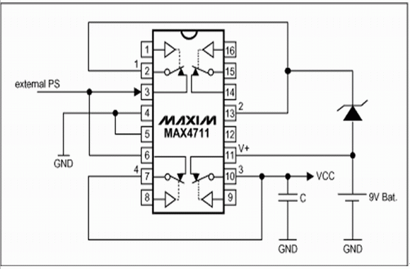 VCC由第10引腳的開關(guān)取出,大多數(shù)應(yīng)用中,這個(gè)電壓還要由后面的電壓調(diào)節(jié)器進(jìn)行調(diào)理。一旦檢測(cè)到外部電源電壓,微控制器接通開關(guān)1和4,斷開開關(guān)3。輸出電容C在VCC由開關(guān)3切向開關(guān)4的過程中為系統(tǒng)提供電源。為了保護(hù)電池,當(dāng)開關(guān)4閉合時(shí),必須始終保持開關(guān)3處于斷開狀態(tài)。外部電源移走后,開關(guān)4和1斷開而開關(guān)3閉合。當(dāng)外部電源電壓高于電池電壓,或電池已深度放電時(shí)接入外部電源,或C已充電而電池被移走時(shí),故障保護(hù)特性可以保證開關(guān)正確、安全地工作。