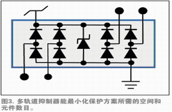 如果產(chǎn)品要在輸入/輸出線中承受某些額外阻抗(如在單端邏輯輸入時經(jīng)常出現(xiàn)的情況),可以通過在外部夾鉗和IC引腳之間增加一個電阻器,使外部和芯片上二極管之間的電流有助于外部防護(圖2b)。一些TVS二極管供應(yīng)商在單一小型組件包里提供兩個結(jié)型二極管和一個TVS夾鉗,進一步減少組件數(shù)目、降低裝配成本,避免互連偏離。這些組件包同樣適用于多軌道情況——單一的組件包為幾條普通供電軌提供保護(圖3)。