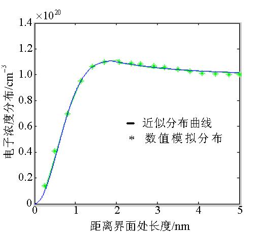 圖2 電子分布的數(shù)值模擬與近似分布曲線