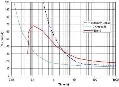 在圖5的示例中有一個點,智能開關(guān) (VN5010)將繼續(xù)前行,而電線將開始自毀(紅線在藍色虛線上方)。如果這種情況是真實的,甚至連電路板都可能會自毀。現(xiàn)在考慮到涌流要求很可能更加嚴格,我們開始意識到有必要開發(fā)一個能夠仿真熔斷器特性的保護算法。