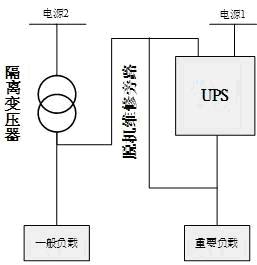 如圖一所示,這個(gè)是石化行業(yè)典型的兩電源的UPS構(gòu)架,由兩路電源,一個(gè)隔離變壓器、一臺UPS組成。UPS采用雙電源回路輸入,UPS主電源由電源1提供,UPS旁路電源有電源2提供,同時(shí)UPS設(shè)置一個(gè)脫機(jī)維修旁路,允許UPS在故障維修或者更換時(shí),系統(tǒng)仍然能夠正常工作。同時(shí)DCS系統(tǒng)中的負(fù)載分為兩個(gè)級別,即一般負(fù)載和重要負(fù)載,重要負(fù)載(一級負(fù)荷)由UPS系統(tǒng)直接供電,一般負(fù)載(三級負(fù)荷)由電源2經(jīng)隔離變壓器后供電。