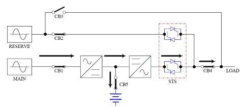 這里指的熱備用狀態(tài)就是指UPS的經(jīng)濟(jì)運(yùn)行模式(ECO)。即市電正?;蛘叻显O(shè)定條件時(shí),用市電直接供電,此時(shí)逆變器工作,但是逆變靜態(tài)開關(guān)不導(dǎo)通,處于熱備份狀態(tài);當(dāng)市電異?;虺鲱A(yù)設(shè)范圍時(shí),UPS逆變靜態(tài)開關(guān)導(dǎo)通,逆變器為負(fù)載供電。采用ECO模式時(shí),整流器和逆變器幾乎不消耗能量,整機(jī)基本上只有風(fēng)機(jī)的功耗。