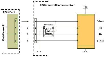 這個辦法的實質是在USB接口附近連接一個保護元器件。它由幾支采用軌對軌結構的二極管組成,本身具有低電容的特性。內部鉗位器件為兩條數(shù)據(jù)線提供±25kVESD(ISO10605)保護功能,以及為Vbus電源線提供保護功能。