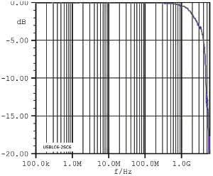 圖3中截止頻率大約為5GHz,遠離USB480Mb/s收發(fā)器的正常工作頻率,因此,USB收發(fā)器可以安全工作。
