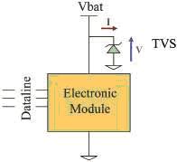 例如,為滿足ISO7637-2標準,特別是圖1中的1、2、3a和3b的脈沖要求,只使用一個瞬變電壓抑制器(TVS)即可有效保護車載模塊。