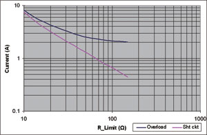 圖2展示NIS5132的一對(duì)曲線。導(dǎo)通較低的曲線時(shí),激活的是短路曲線。一旦電流降低至低于這個(gè)電平,F(xiàn)ET就完全導(dǎo)通(線性區(qū)域),接下來面對(duì)的就是過載電平。如果電流達(dá)到過載電平,F(xiàn)ET的柵驅(qū)動(dòng)將立即減小,而漏極至源極電壓將增加,并會(huì)將工作模式改為短路電平模式。這器件在過載電平時(shí)不能維持穩(wěn)態(tài)工作。