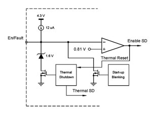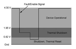 圖5顯示的是這電路的信號(hào)電平,而圖6顯示的是等效原理圖。在正常工作中,內(nèi)部電流源將啟用引腳上拉至4.3V。如果發(fā)生熱故障,由于過大直流電流、限流或過壓保護(hù)原因,這器件將關(guān)閉,熱邏輯將把這信號(hào)下拉至1.6V電平。