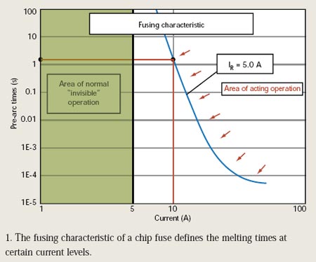熔斷特性是芯片保險絲最重要的屬性(圖1)。該特性界定了在一定電過流條件下的熔斷時間。若電流達到一定預設值,則在稱為弧前(pre-arc)時間的一個已知期限內(nèi),熔斷元件內(nèi)耗散的電能足以把其熔化并汽化。
