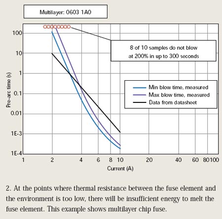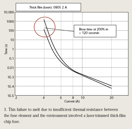 若熔斷元件和環(huán)境間的熱阻抗過低,將沒有足夠能量融化熔斷元件。這將使保險絲不能在120秒內(nèi)切斷相當于額定電流兩倍的過載電流。圖2和圖3說明了多層片式保險絲以及激光調割厚膜芯片保險絲的這種情況。