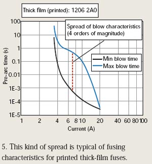 源于這種阻值變化,芯片保險絲可能在正常浪涌電流條件下熔斷?;蚍催^來說,它也可能在過載條件下需要熔斷時而沒能熔斷。當然,這是工程師必須避免的最壞情況。圖5顯示了印刷厚膜保險絲熔斷特性的典型擴散。