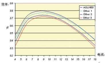 注意到圖2中,除了柵極結(jié)構(gòu),其他的部分就是標(biāo)準(zhǔn)的采用Trench工藝的MOSFET。柵極被分割成上下兩個(gè)部分,下部分用一些特殊的材料屏蔽起來,下部分在內(nèi)部和上部分的柵極相連,而柵極的屏蔽層被連接到源極,從而減小漏極柵極米勒電容。用這種技術(shù)設(shè)計(jì)的MOSFET如AOL1464,其Vds為30V,Vgs在10V條件下Rds(on)為6.2mΩ,而其Crss只有20pF,極大地減小了開關(guān)過程中米勒平臺(tái)的持續(xù)的時(shí)間,降低了開關(guān)損耗。AOL1430,其Vds為30V,Vgs在10V條件下Rds(on)為2.5mΩ,而其Crss為50pF。圖3中,下管采用AOS的AOL1428,上管采用AOL1430和其他廠家目前Crss最低的器件的效率曲線,可見,上管采用AOL1430具有非常高的效率。注意:輸入電壓12V,輸出電壓 1.7V,開關(guān)頻率300kHz。