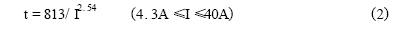 由表1可知,RXE系列PolySwitch元件所能承受的最大電流為40A。該點(diǎn)與臨界點(diǎn)之間為曲線的直線部分。設(shè)動作時(shí)間為t(秒),故障電流為I(安),考慮到橫軸、縱軸均為對數(shù)坐標(biāo),兩者之間應(yīng)具有如下數(shù)學(xué)關(guān)系: