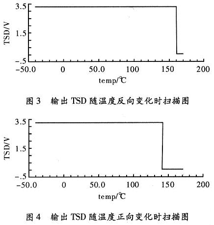 按照以上設(shè)計的電路。用Cadence Specture對其進(jìn)行仿真,器件的模型參數(shù)采用0.35μm CMOS工藝。圖2為過溫保護(hù)電路的輸出控制信號TSD,隨溫度上升和下降的曲線。電源電壓取3.3 V。從仿真結(jié)果可以看出,該電路實現(xiàn)了良好的“溫度遲滯”特性。遲滯功能有效的避免了芯片出現(xiàn)熱振蕩問題。關(guān)斷溫度TH160°和恢復(fù)溫度TL140°。