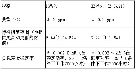 - H系列的最大TCR為±2ppm/℃,Z-Foil HZ系列的最大TCR僅有±0.2ppm/℃