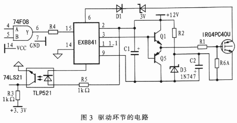 EXB841的6引腳連接的二極管可檢測IGBT的飽和壓降,用來完成過流保護功能,4引腳的過流保護信號延時10μs輸出。當IGBT有過流時,若UCE大于7.5V,內(nèi)部過流保護電路開始動作,軟關(guān)斷IG-BT。通常在IGBT通過額定電流時UCE為3.5V,當UCE=7.5V時,IGBT有過流,其值約為額定電流的3~5倍,但是由于沒有達到保護的閾值,保護電路不起作用。如果長時間工作在這種狀態(tài),則會導(dǎo)致IGBT損壞。為了可靠地保護IGBT,應(yīng)該降低過流保護閾值,可以在D1與IGBT的集電極間反串一個穩(wěn)壓管,或多串幾個與D1同規(guī)格的快速恢復(fù)二極管。如圖3通過反串一個IN4728型3.3V穩(wěn)壓管使保護閾值降為4.2V。當檢測到IGBT過流后,5引腳變?yōu)榈碗娖?,TPL521型光耦輸出低電平,通過與門封鎖控制信號輸入,同時使4輸入與非門輸出低電平,觸發(fā)功率驅(qū)動保護中斷,完成相應(yīng)的保護處理。