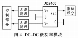 控制電路為弱電部分,極易受到干擾;驅(qū)動電路直接與外電路連接,是一個較強的干擾源;為了實現(xiàn)整個設(shè)備的電磁兼容,控制電路部分必須與驅(qū)動部分隔離。為了避免公共電源對控制電路產(chǎn)生干擾,應(yīng)對控制電路及驅(qū)動電路分別供電,EXB84l的電源電壓為+20V,一般控制電路的供電電壓為5V,因此,可以利用圖4所示的DC-DC微功率模塊進行電源隔離,采用A2405D型微功率模塊實現(xiàn)電源的隔離。